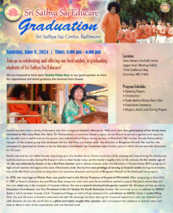 SSSGC – Baltimore Sai Center Graduation Day Celebrations: please join us at our SSSE graduation on June 8th from 3:00 pm – 6:00 pm. We are honored to have Sister Geetha Mohan Ram as a guest speaker. 🙏🏼 (Flyer Attached)