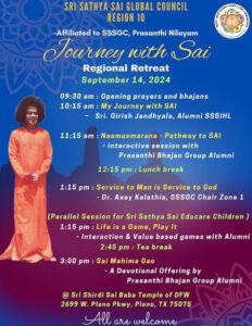 Offering our most reverential pranamas at the Divine Lotus Feet of our Dearest Lord Bhagavan Sri Sathya Sai Baba. We are delighted to announce that SSSGC-USA Region 2 will be hosting the second Sai-lent Retreat of 2024 in October. Here are the details: